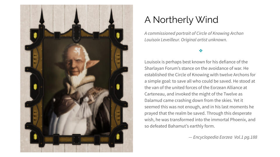 The Greater Eorzean Museum of Fine Art is a non-profit gallery featuring artwork found within Final Fantasy XIV. Come visit us today and see our collection of portraits, sculptures, sightseeing log paintings, and more!